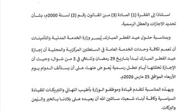 وزارة الخدمة المدنية تعلن إجازة عيد الفطر لكافة وحدات الخدمة العامة وتحدد موعد استئناف الدوام