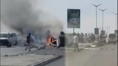 احتراق سيارة عقب اصطدامها بعمود إنارة في الطريق البحري بعدن