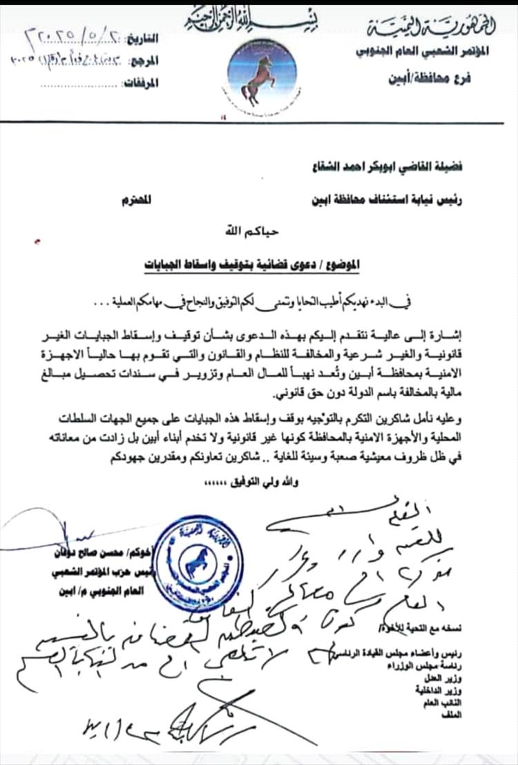 في خطوة لافتة، تقدّم محسن صالح دوفان، رئيس فرع المؤتمر الشعبي العام الجنوبي بمحافظة أبين، بدعوى قضائية إلى رئيس نيابة استئناف محافظة أبين القاضي أبوبكر أحمد الشقاع، طالب فيها بإيقاف وإسقاط كافة الجبايات التي تُفرض من قبل السلطات المحلية والأجهزة الأمنية في المحافظة، معتبرًا إياها غير قانونية وتعد “نهبًا منظمًا للمال العام”.