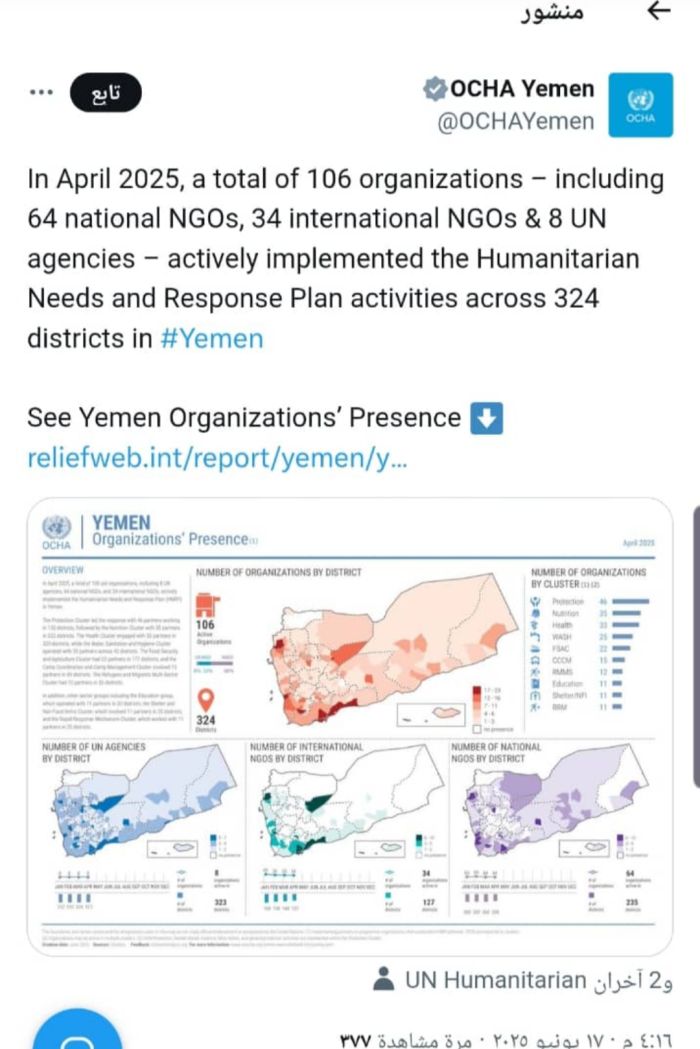كشف مكتب تنسيق الشؤون الإنسانية التابع للأمم المتحدة (أوتشا) عن وجود فاعل لـ106 منظمات إنسانية تعمل في مختلف مناطق اليمن، ضمن إطار تنفيذ خطة الاحتياجات الإنسانية والاستجابة (HNRP) خلال شهر أبريل 2025.