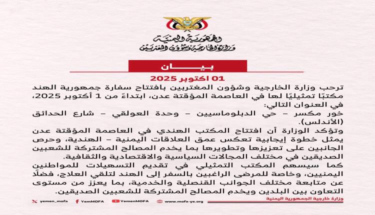 ورحبت وزارة الخارجية وشؤون المغتربين بافتتاح سفارة جمهورية الهند الصديقة مكتبا تمثيليا لها في العاصمة المؤقتة عدن.