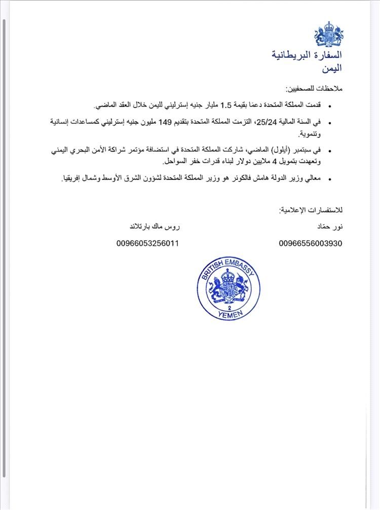 وأشار البيان إلى أن الوزير البريطاني اختتم زيارته التي استمرت يومين، حيث التقى خلالها بقيادات في الحكومة اليمنية، بينهم رئيس الوزراء وأعضاء في مجلس القيادة الرئاسي، إضافة إلى مقابلات مع ممثلين عن الشباب. كما تفقد معسكر النازحين بدار سعد، واطّلع على مشاريع التغذية والتنمية، وبرامج المساعدات الممولة من المملكة المتحدة.