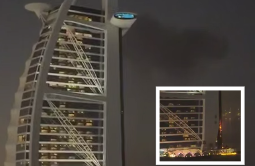 انتشر على مواقع التواصل الاجتماعي، مقاطع فيديو تظهر حريقا في “برج العرب” بإمارة دبي، جراء إصابته بطائرة مسيّرة إيرانية.