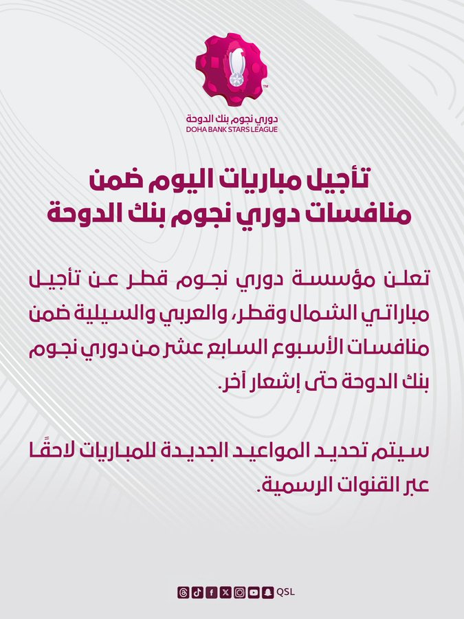 وأعلنت مؤسسة دوري نجوم قطر عبر حسابها على منصة “X” اليوم السبت، تأجيل مباراتين من المسابقة حتى إشعار آخر بسبب الظروف الراهنة في المنطقة، حيث تشهد هجمات متبادلة بين إسرائيل وإيران.