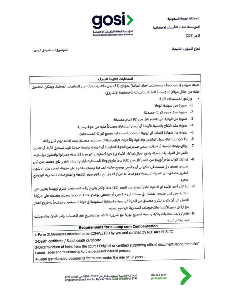 دعت السفارة اليمنية في الرياض ذوي عدد من المواطنين اليمنيين المتوفين في المملكة العربية السعودية إلى سرعة استكمال الإجراءات والوثائق المطلوبة لصرف مستحقاتهم المالية لدى المؤسسة العامة للتأمينات الاجتماعية السعودية.