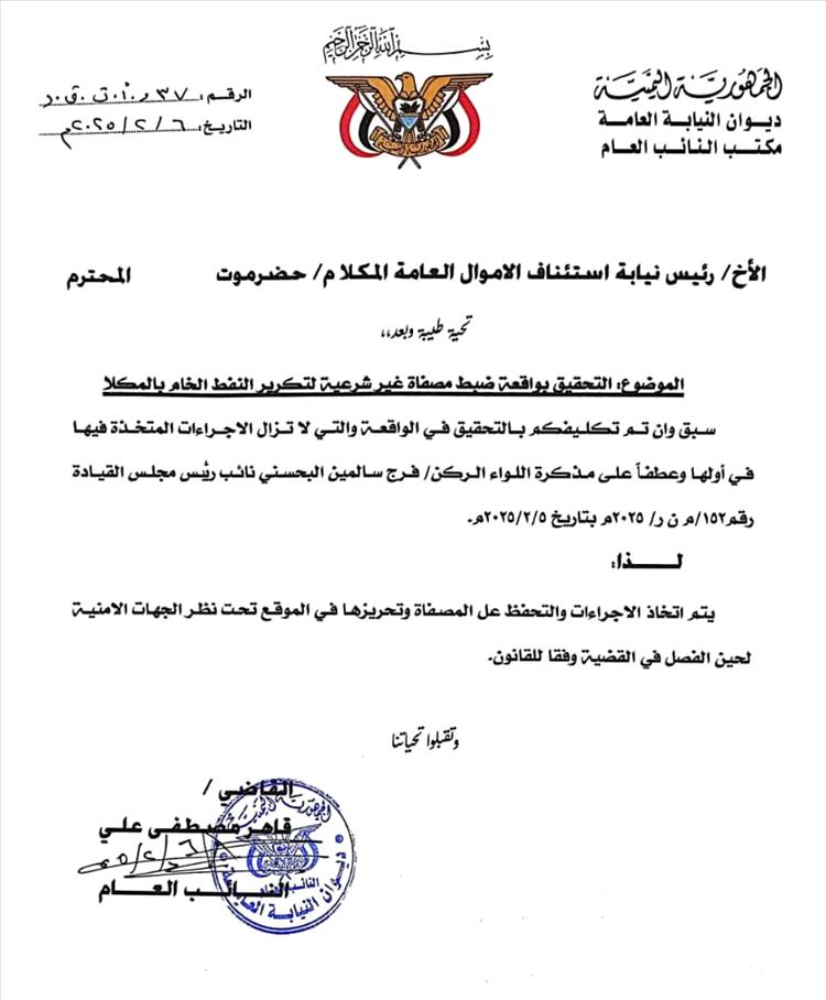 أصدر النائب العام مذكرة رقم (٣٧ ، أ .ت .ق .د) بتوجيه لنيابة الأموال العامة في محافظة حضرموت لفتح تحقيق شامل في قضية المصفاة الغير الشرعية. كما شمل التوجيه التحفظ على المصفاة وتحريزها، وتكليف الأجهزة الأمنية باستلام الموقع لمنع تشغليها.