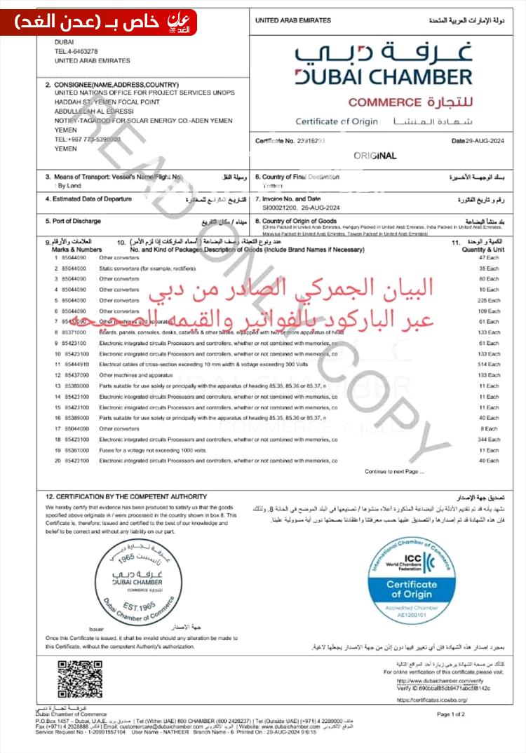 وأظهرت المستندات أن الشحنة، التي تتضمن محولات ومنظمات شحن وملحقاتها، تم تسجيلها بقيمة 2,920,652 درهمًا، بينما تُثبت الوثائق الأصلية أن القيمة الحقيقية لها تبلغ 2,157,958 درهمًا، ما يشير إلى محاولة تضخيم الفاتورة بفارق مالي كبير.