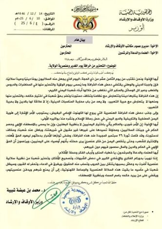 أكمل القراءة »نافذة عدن/ خاص: أكدت وزارة الأوقاف والإرشاد في الحكومة اليمنية، أن ما يُعرف بـ”يوم الغدير”، الذي تحتفي به عصابة الحوثي…