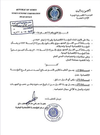أكمل القراءة »نافذة عدن/خاص: أصدر المدير العام للمؤسسة الاقتصادية اليمنية، العميد سامي صالح السعيدي، القرار الإداري رقم (6) لسنة 2025، قضى بتعيين…