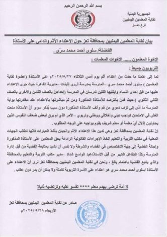 نقابة المعلمين بتعز تدين اعتداءً على معلمة وتطالب بتحقيق عاجل