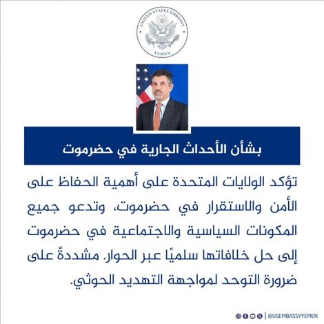 نافذة عدن/ خاص: أكدت السفارة الأمريكية في اليمن أهمية الحفاظ على الأمن والاستقرار في محافظة حضرموت، داعية كافة المكونات السياسية…