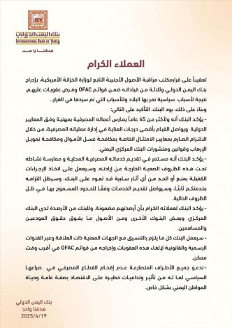 أكمل القراءة »نافذة عدن/خاص: أصدر بنك اليمن الدولي، يوم السبت، بيانًا توضيحيًا عقب إدراجه من قبل مكتب مراقبة الأصول الأجنبية التابع لوزارة…