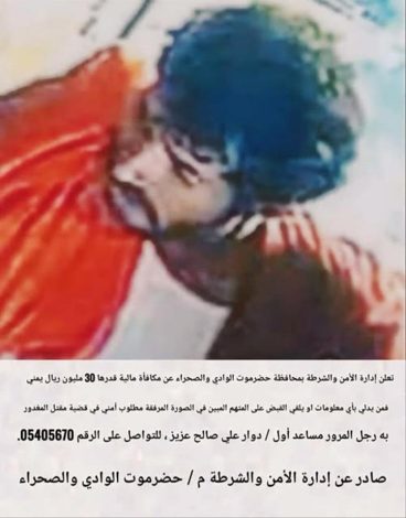 شرطة حضرموت تعلن عن مكافأة بـ30 مليون للقبض أو إعطاء معلومات على مطلوب أمني