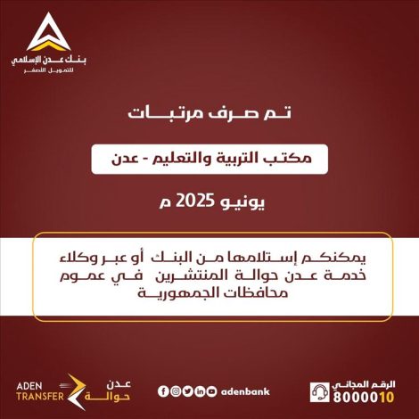 نافذة عدن/ خاص: أعلن بنك عدن الإسلامي للتمويل الأصغر، اليوم الخميس، عن بدء صرف مرتبات موظفي مكتب التربية والتعليم في…