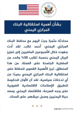 نافذة عدن/ خاص: أكدت السفارة الأمريكية في اليمن، في بيان صدر الخميس، على أهمية استقلالية البنك المركزي اليمني وضرورة حمايته…