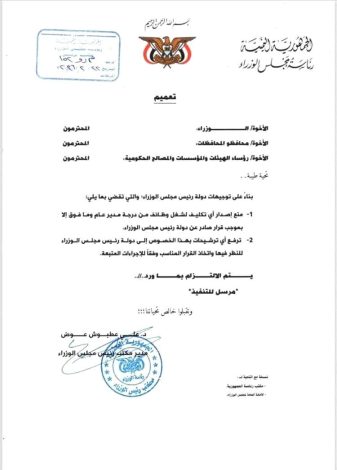 نافذة عدن/خاص: ‏أصدرت رئاسة مجلس الوزراء تعميماً موجهاً إلى الوزراء ومحافظي المحافظات ورؤساء الهيئات والمؤسسات والمصالح الحكومية، يقضي بعدم إصدار…