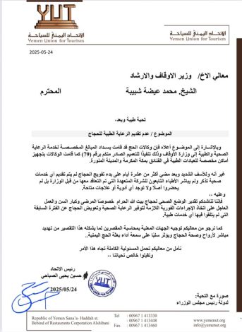 أكمل القراءة »نافذة عدن/خاص: وجّه الاتحاد اليمني للسياحة، يوم السبت، رسالة رسمية إلى معالي وزير الأوقاف والإرشاد الشيخ محمد عيضة شبيبة، أعرب…