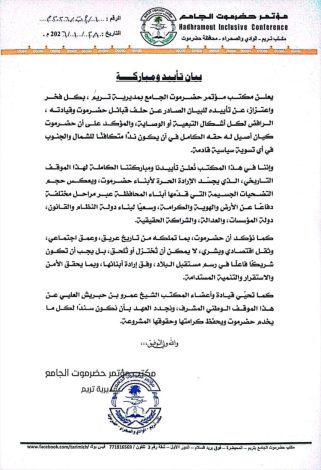 أكمل القراءة »نافذة عدن/ خاص : يعلن مكتب مؤتمر حضرموت الجامع بمديرية تريم ، بكل فخر واعتزاز، عن تأييده للبيان الصادر عن…
